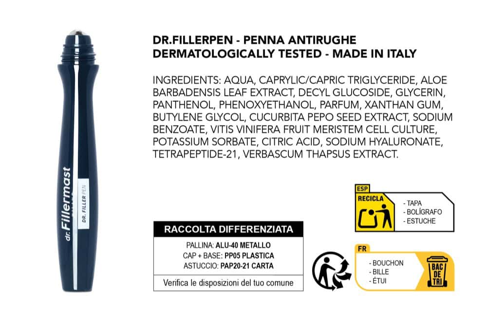 Dr Fillerpen è un dispositivo biorivitalizzante progettato per riempire le rughe e le linee sottili della cute riducendone l’aspetto. Una penna dal formato discreto ed elegante, composta da un applicatore dalla caratteristica punta sferica massaggiante.