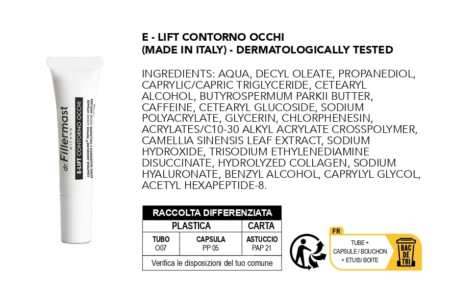 E-lift è un contorno occhi all’Acido Ialuronico e Collagene: l’effetto di questi due principi, insieme all’azione di Argireline Peptide e caffeina, garantisce un’azione mirata a contrastare e ridurre un contorno occhi segnato da rughe, borse e occhiaie.