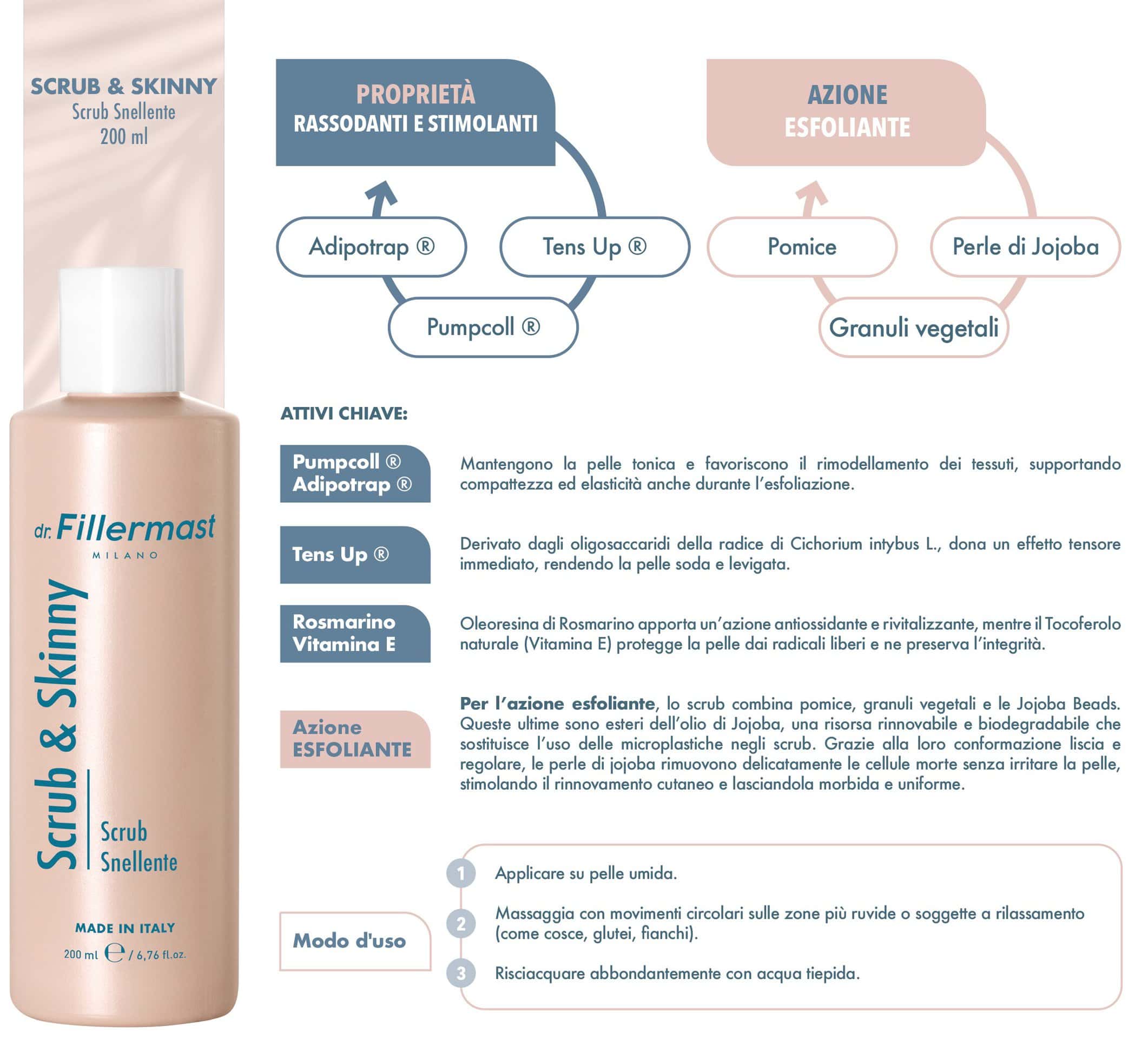 Scrub & Skinny è lo scrub snellente che unisce l’azione esfoliante alla potenza rassodante in un solo gesto. La sua texture combina pomice, granuli vegetali e le preziose perle di jojoba per rimuovere delicatamente le cellule morte, lasciando la pelle morbida e uniforme. Arricchito con Pumpcoll®, Adipotrap® e Tens Up®, questo prodotto per il corpo mantiene la pelle tonica e favorisce il rimodellamento dei tessuti, supportando compattezza ed elasticità anche durante l’esfoliazione. Il rosmarino e la vitamina E proteggono dai radicali liberi, mentre la conformazione liscia e regolare delle perle di jojoba garantisce un’esfoliazione delicata ma efficace. Perfetto per chi vuole sentirsi rinnovata e tonica.