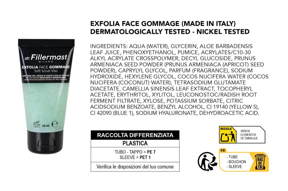 MODO D’USO: Riscaldare una piccola quantità di esfoliante tra le mani e applicare sulla pelle precedentemente detersa e inumidita. Massaggiare delicatamente senza sfregare né premere, evitando il contorno occhi. Risciacquare accuratamente con abbondante acqua. Per un’azione mirata, utilizzare Exfolia Face Gommage 2-3 volte a settimana e successivamente detergere la pelle con la crema idratante.