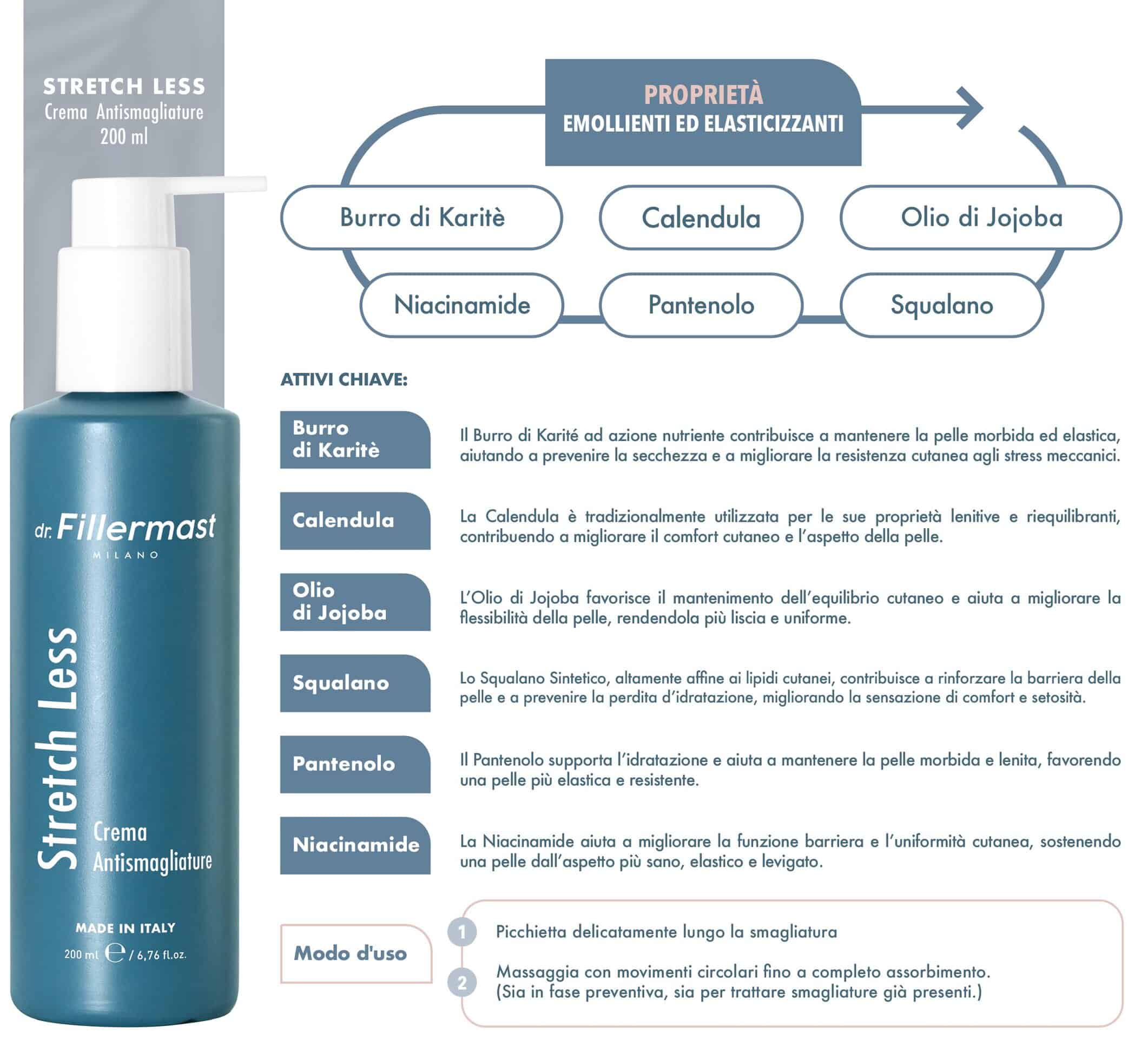 Stretch Less è la crema antismagliature con proprietà emollienti ed elasticizzanti, studiata per prevenire e trattare le smagliature già presenti. Il burro di karité ad azione nutriente aiuta a mantenere la pelle morbida ed elastica, prevenendo la secchezza e migliorando la resistenza cutanea agli stress meccanici. La calendula è tradizionalmente utilizzata per le sue proprietà lenitive e riequilibranti, mentre l’olio di jojoba favorisce il mantenimento dell’equilibrio cutaneo migliorando la flessibilità della pelle. Lo squalano, altamente affine ai lipidi cutanei, contribuisce a rinforzare la barriera della pelle prevenendo la perdita d’idratazione. Il pantenolo supporta l’idratazione e aiuta a mantenere la pelle morbida e lenita, mentre la niacinamide migliora la funzione barriera e l’uniformità cutanea. Un trattamento corpo completo per una pelle più elastica e levigata.